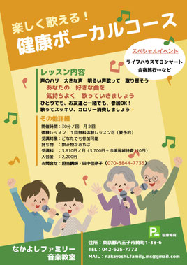 2025/09/06 健康ボーカルコース 本日ご紹介の音楽教室「なかよしファミリー八王子教室」が今年初夏から、大人のための楽しく歌える!「健康ボーカルコース」を始めました。 レッスンの内容は… あなたの好きな曲を気持ちよく歌って行きましょう! ひとりでも お友達と一緒でも 歌ってすっきり カロリーを消費 そして心も体も健康へ レッスン1回30分 月2回 (体験レッスン1回無料予約制) 月謝 3810円(3700円冷暖房維持費110円) TEL 合同会社亜音 042ー625ー7772 ぜひ体験においでください。 tagPlaceholderカテゴリ: コメントをお書きください コメント: 0